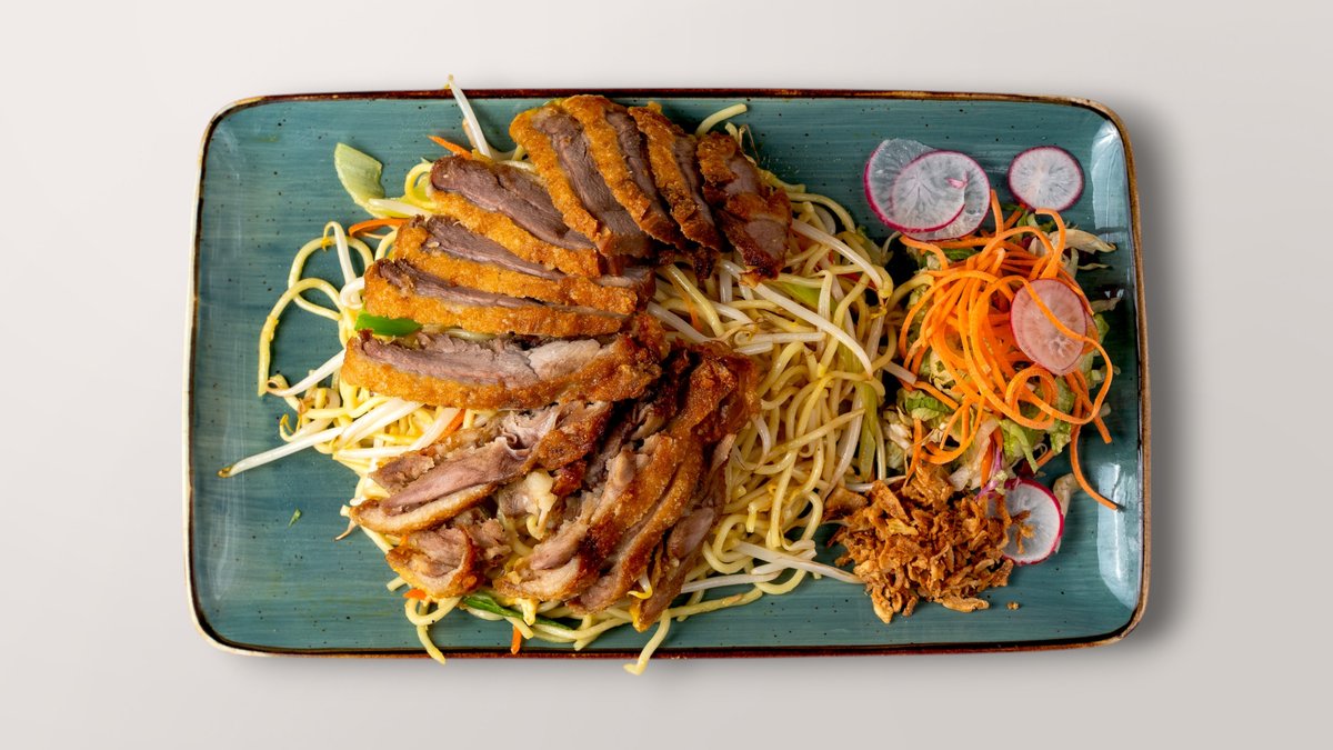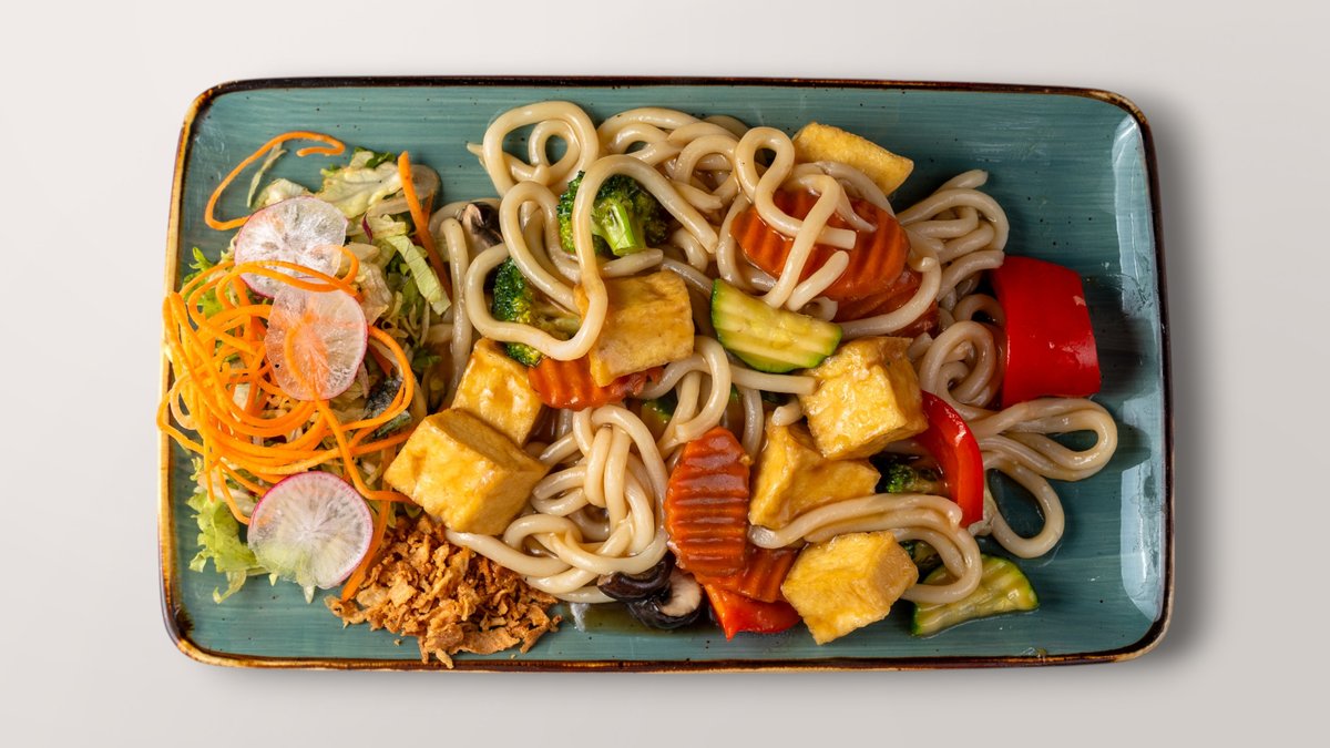 gebratene Udon-Nudeln mit saisonalem Gemüse, Sojasoße und einer Zutat deiner Wahl