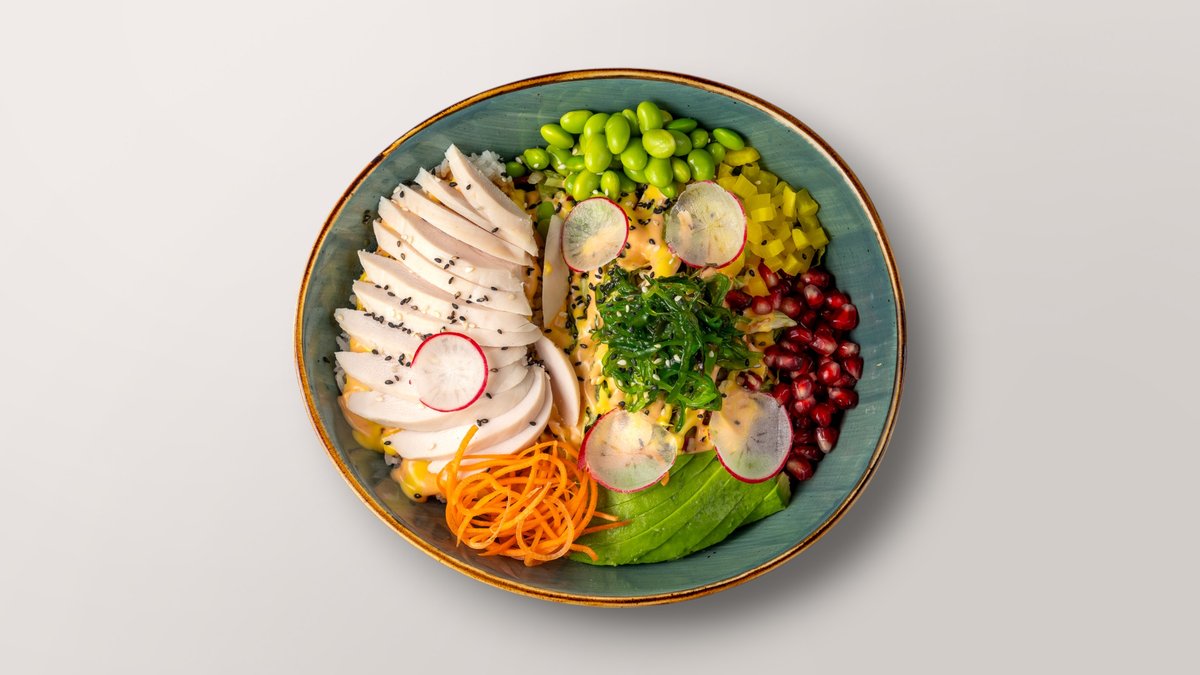 mit Reis, verschiedenem Gemüse, Edamame, Avocado, Sesam, Granatapfel, Kimchi, Mangosoße, Avocadosoße und einer Zutat deiner Wahl