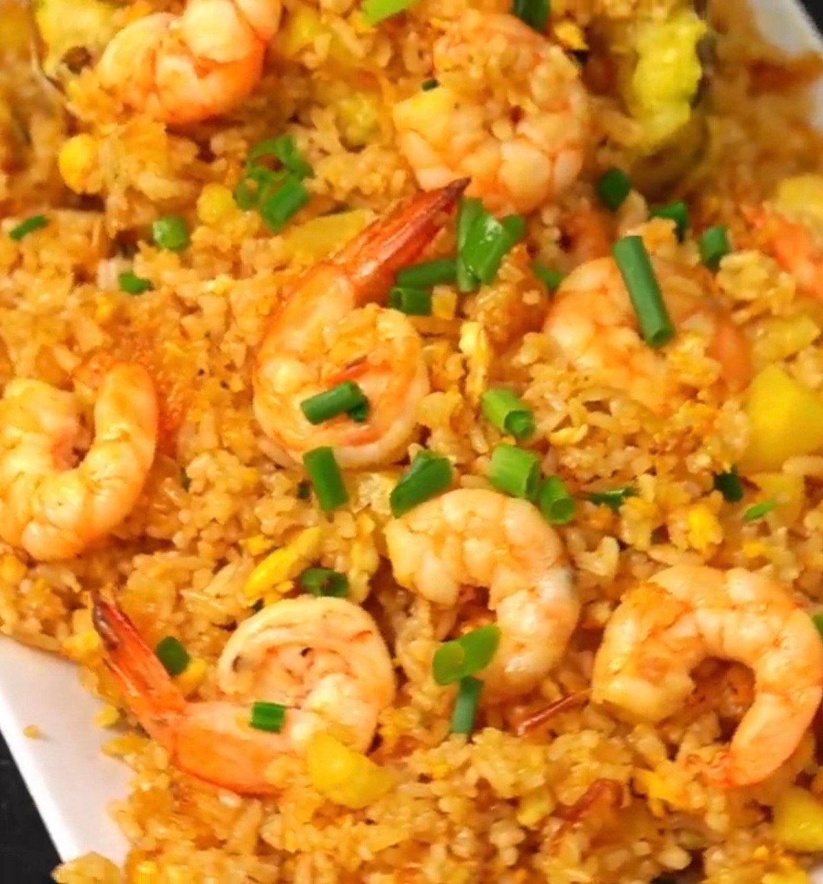 Gebratener Reis mit Coktailschrimps, Gemüse und Röstzwiebeln