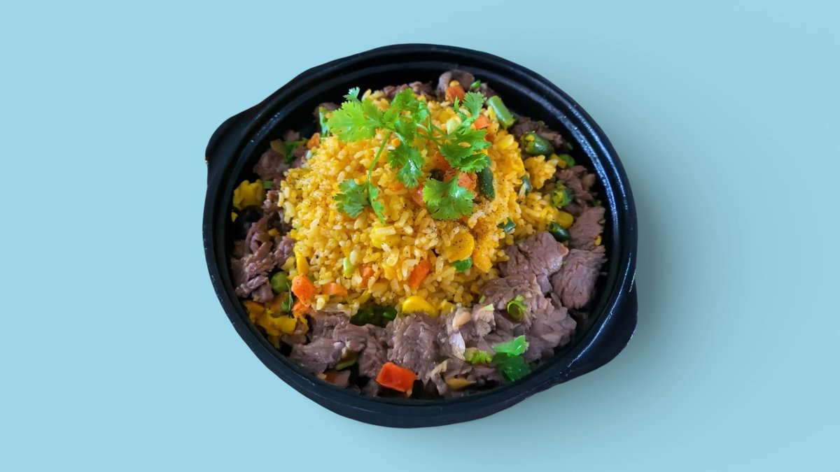 Gebratener Reis mit Rindfleisch (Argent. Hüftsteak) mit Gemüseund Röstzwiebeln