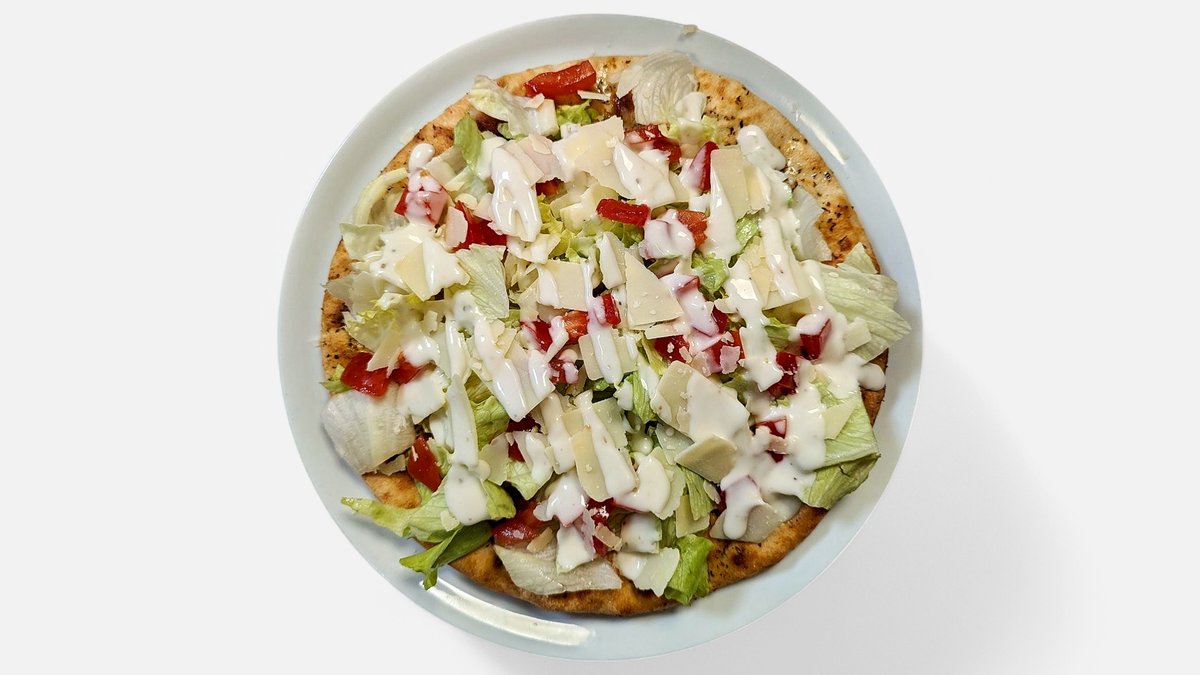 mit Knoblauch-Olivenöl, Oregano, Eisbergsalat Tomatenwürfel, Parmesanflocken und Caeserdressing
