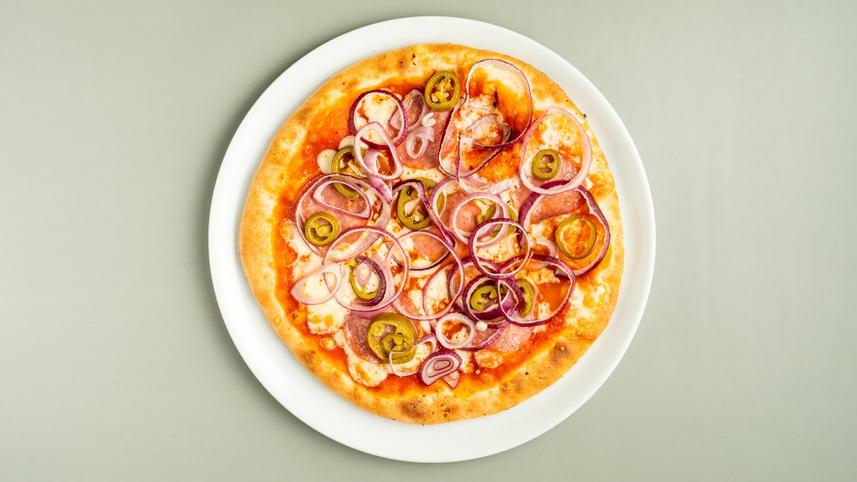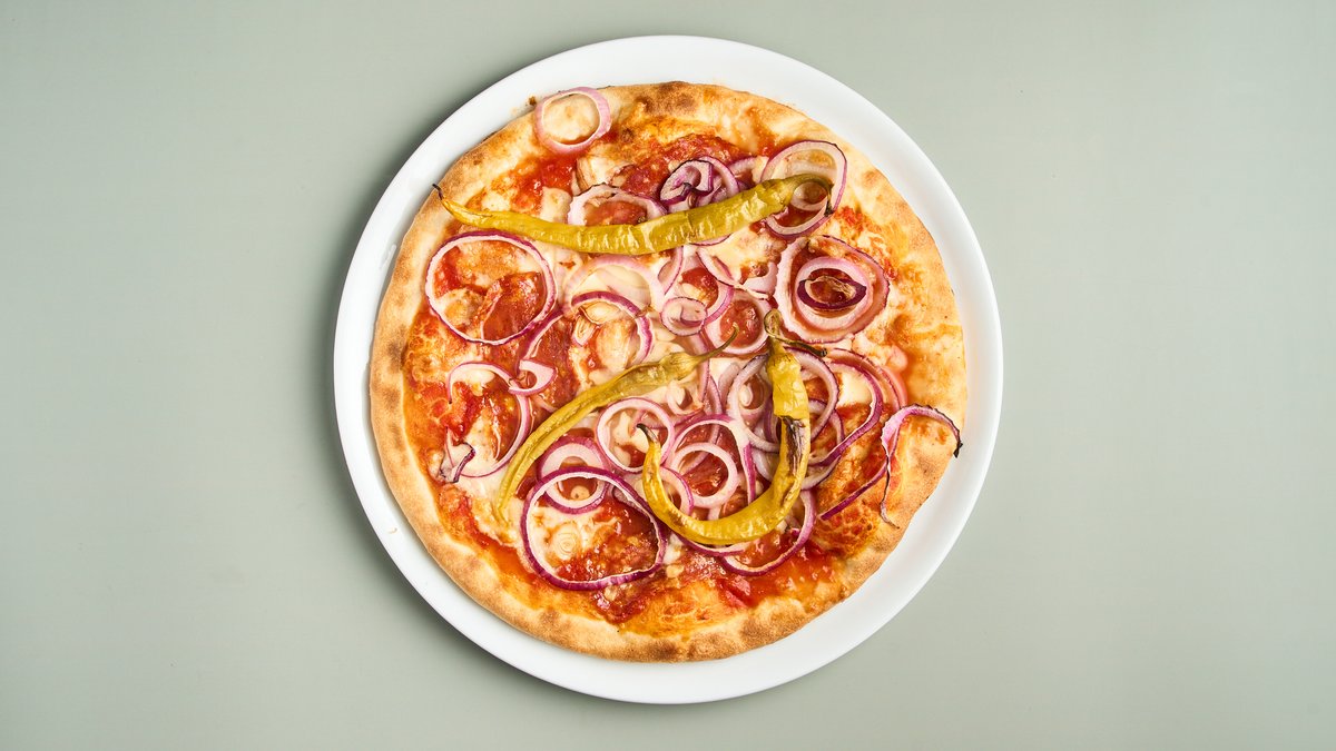 mit Tomatensoße, Chiliflocken, scharfer Salami vom Schwein, Zwiebeln und Peperoni