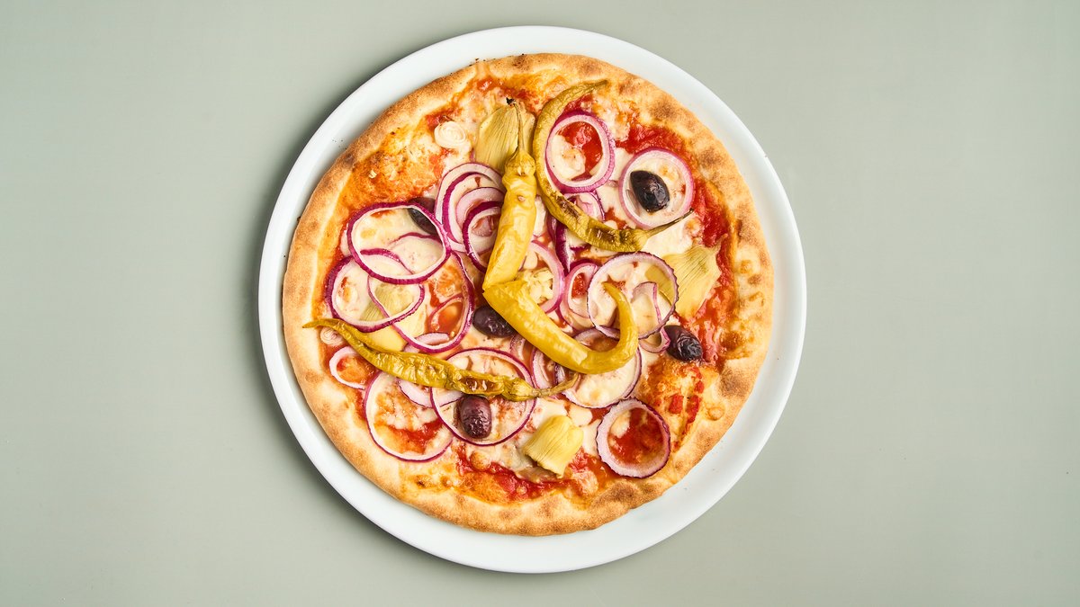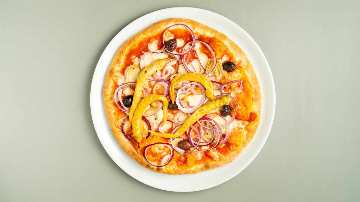 mit Tomatensoße, Artischocken, Kalamata Oliven, Zwiebeln und Peperoni