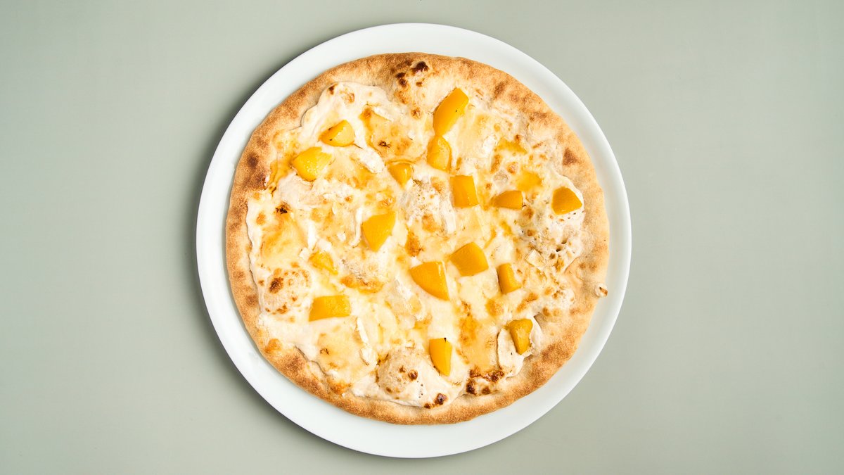 mit Tomatensoße, veganem Hähnchen, Pfirsich und Sweet Chili Sauce