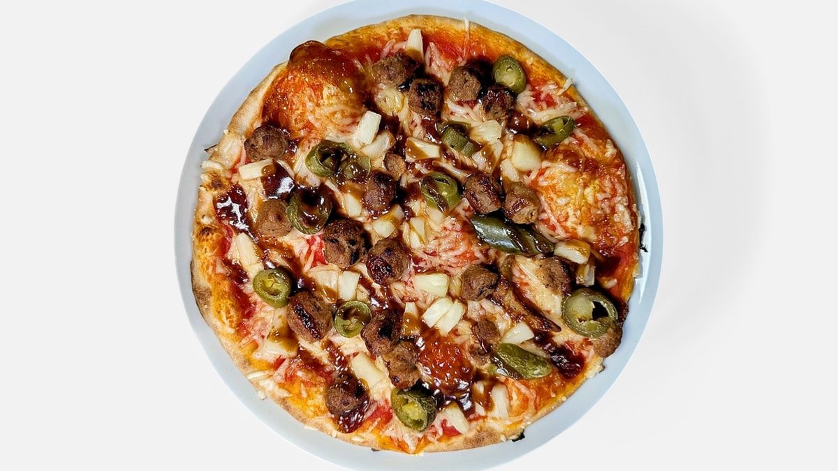 mit Tomatensoße, veganem Hähnchen, Ananas, Jalapenos und Barbecuesoße