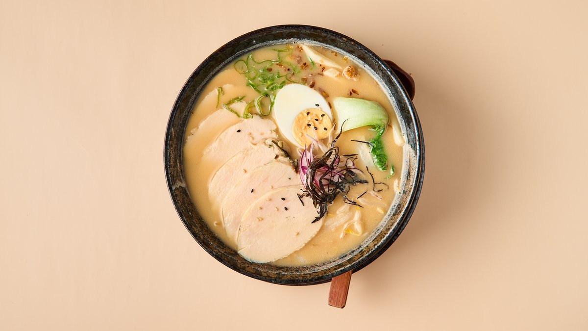 mit japanischen traditionellen Nudeln, Gemüse, Ei, Nori und frischem Kräuter in hausgemachte Brühe
