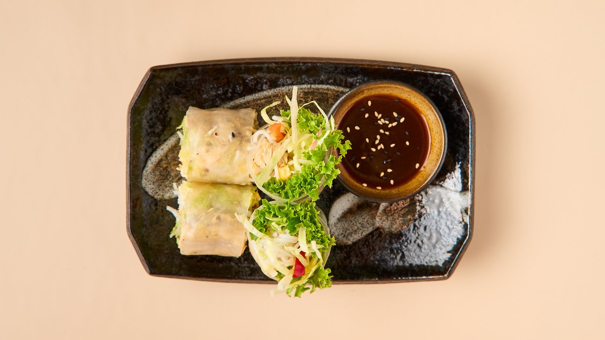 knusprig gebacken 2x große Frühlingsrollen mit Glasnudeln, Kohl, Möhren, asiatischen Pilzen und Schweinehack in Reispapier