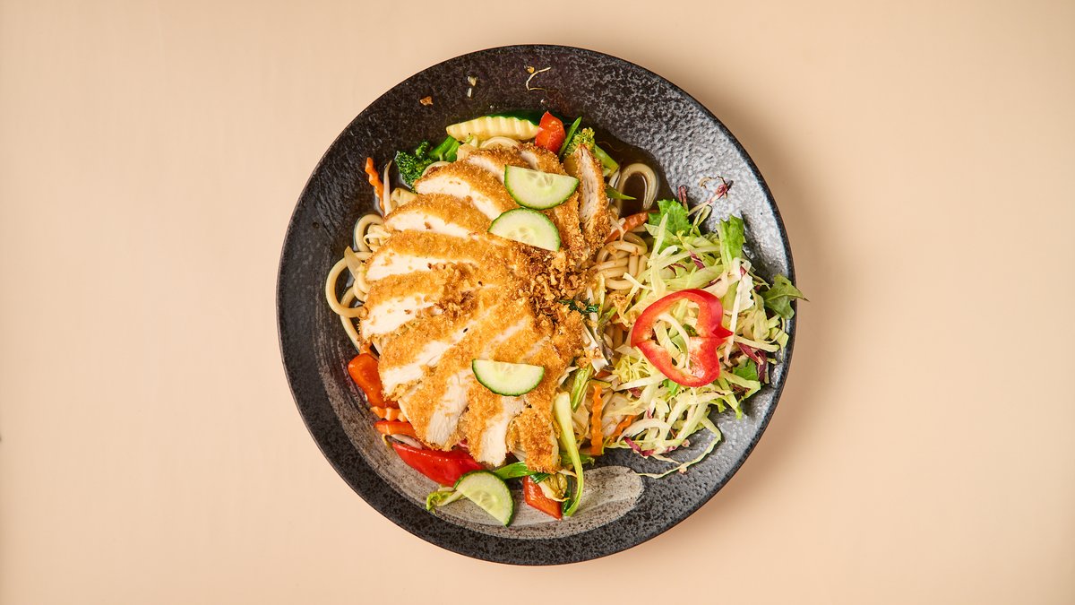 mit gebratenen Udon Nudeln, Gemüse, Kräutern, Röstzwiebeln und Teriyaki-Soße