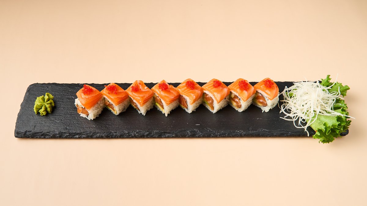 mit panierten Garnelen, Avocado, Gurken, Sesam und flambiertem Lachs umwickelt mit Lachstatar darüber