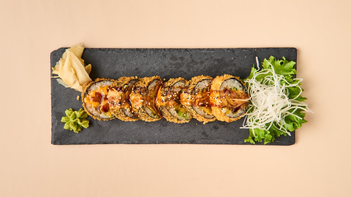 6 Stück panierte Inside out Roll mit gekochtem Thunfisch, Avocado, Unagi-Soße und Mayonnaise
