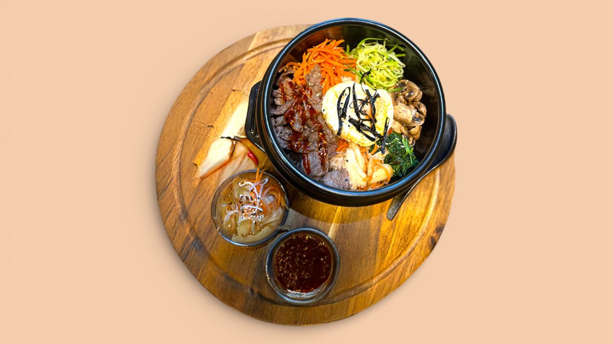 Eine steintopf mit Tofu , verschiedene Gemüse und würziger Gochujang- Chilipaste auf Reis