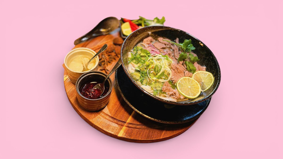Vietnamesiche Reisbandnuldelsuppe mit traditionelle 5 Kräuter , Sojasprossen, frischem Koriander und Frühlingszwiebel.