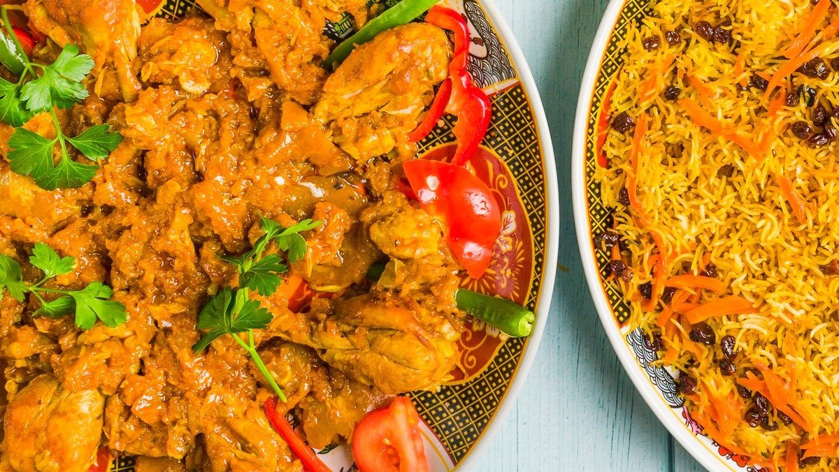 Reis-Teller mit Hähnchenschenkeln und Rosinen