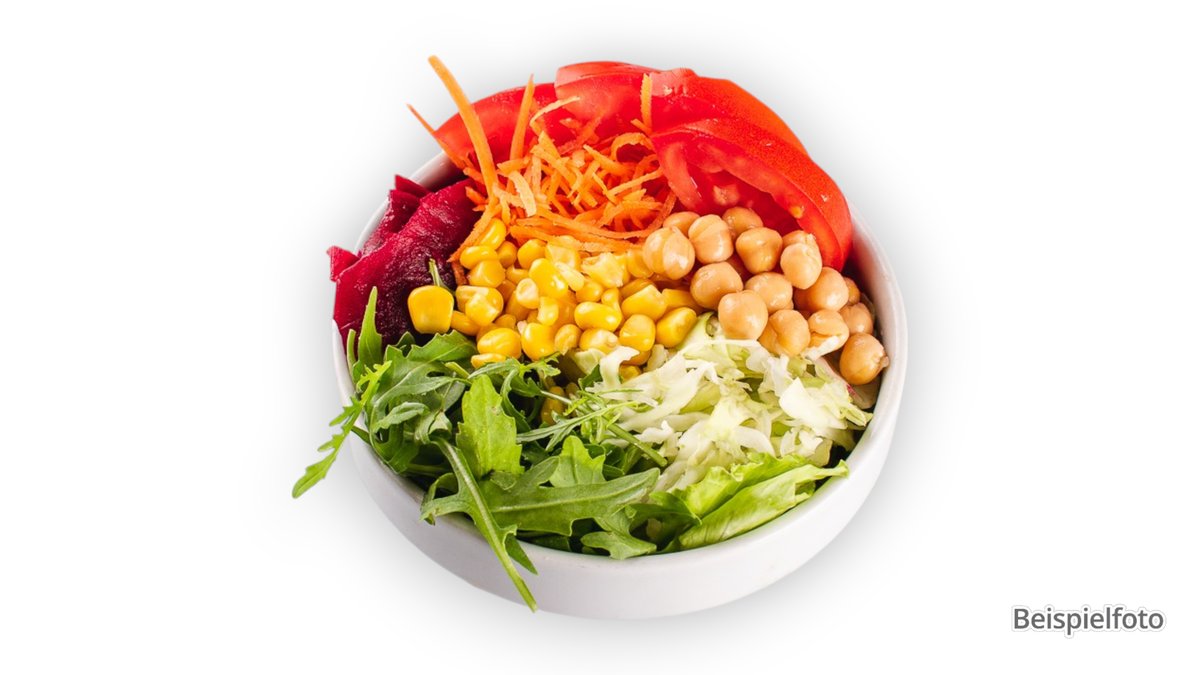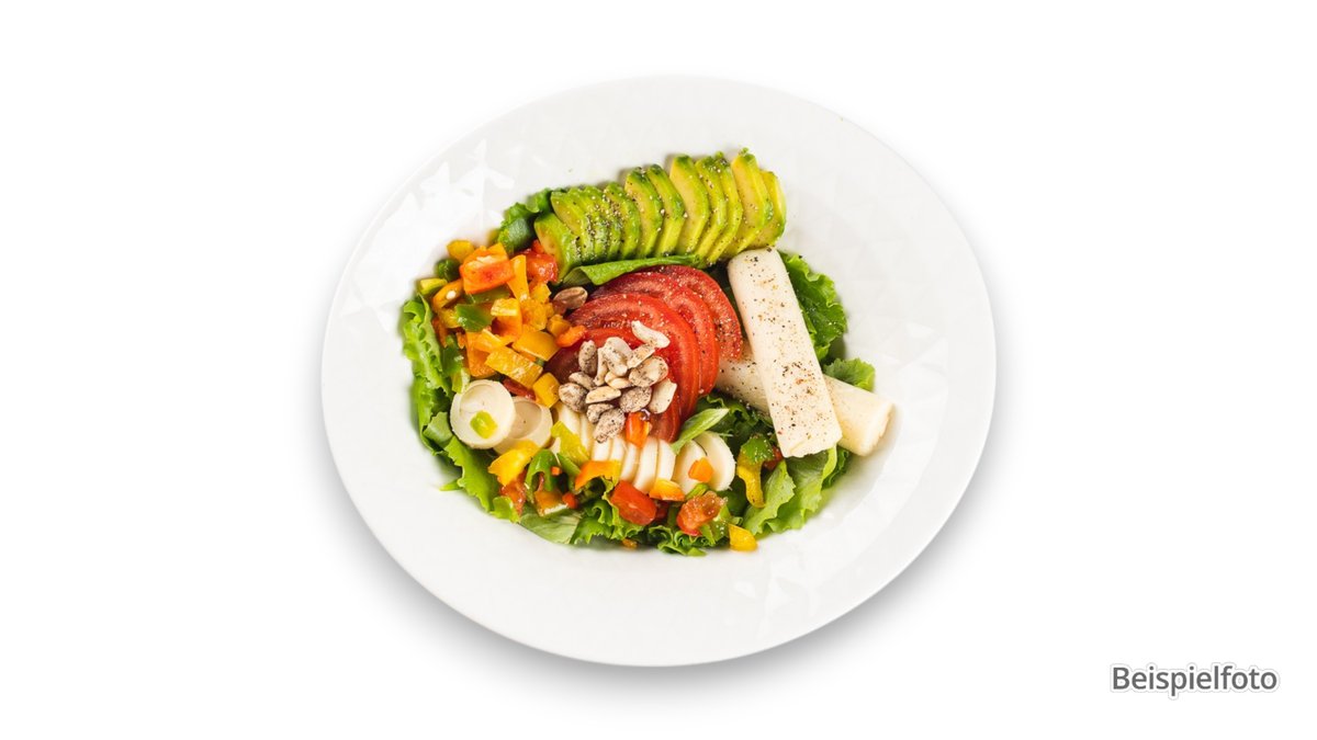 mit Eisbergsalat, Avocado, Kirschtomaten, Rucola und Oliven