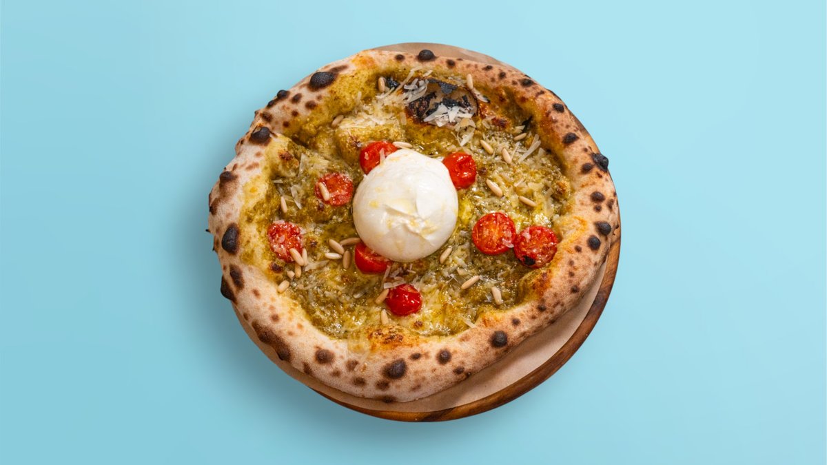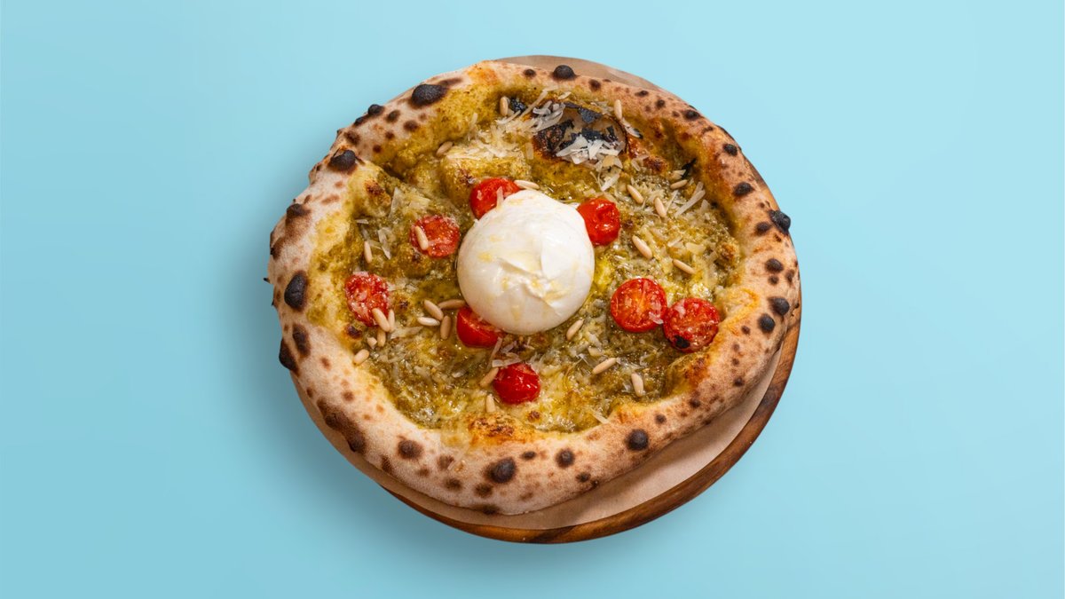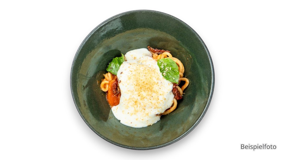 mit Pesto, Kirschtomaten, frisches Basilikum, Parmigiano, Olivenöl, Burrata und Pinienkerne