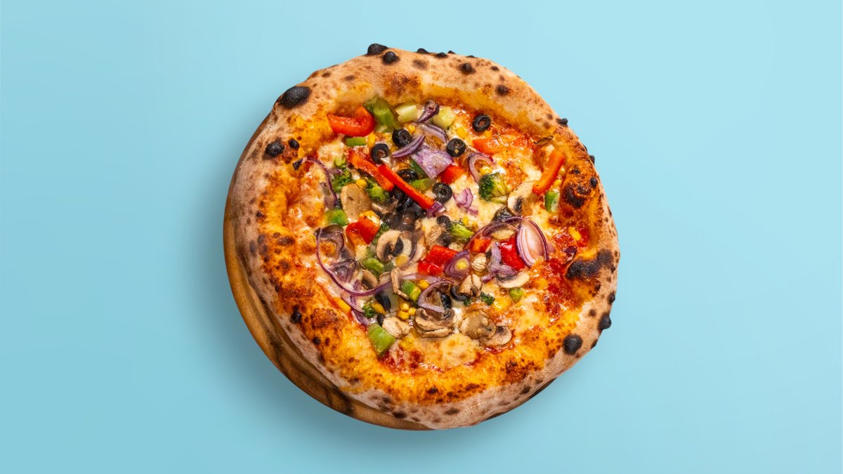 mit Tomatensoße, Käse, Brokkoli, Paprika, Mais und Sauce hollandaise