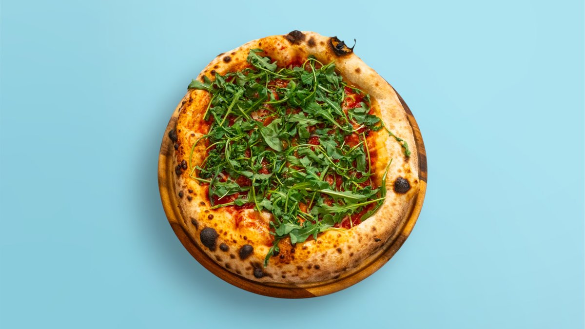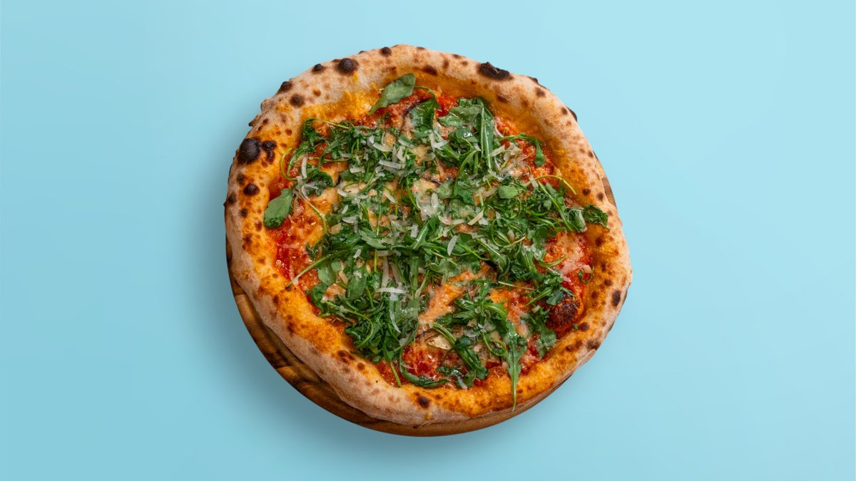 mit Tomatensoße, Knoblauch, Oregano, Rucola und Olivenöl