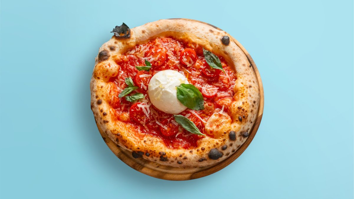 mit Tomatensoße, Büffelmozzarella, frisches Basilikum, Parmigiano, Olivenöl und Kirschtomaten