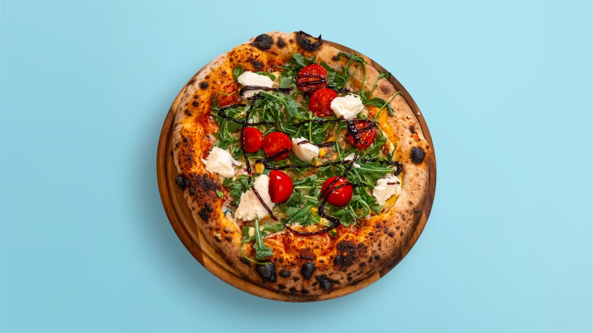 mit Tomatensoße, Käse, Kirschtomaten, Mozzarella, Rucola und Balsamico