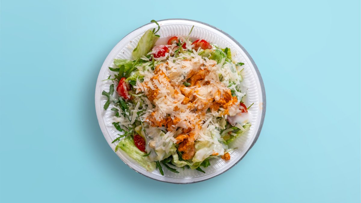 mit Kirschtomaten, Romanasalat, Caesar Dressing, Hähnchen, Rucola und Parmigiano