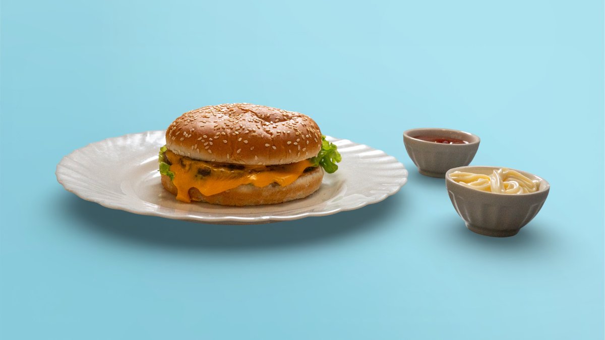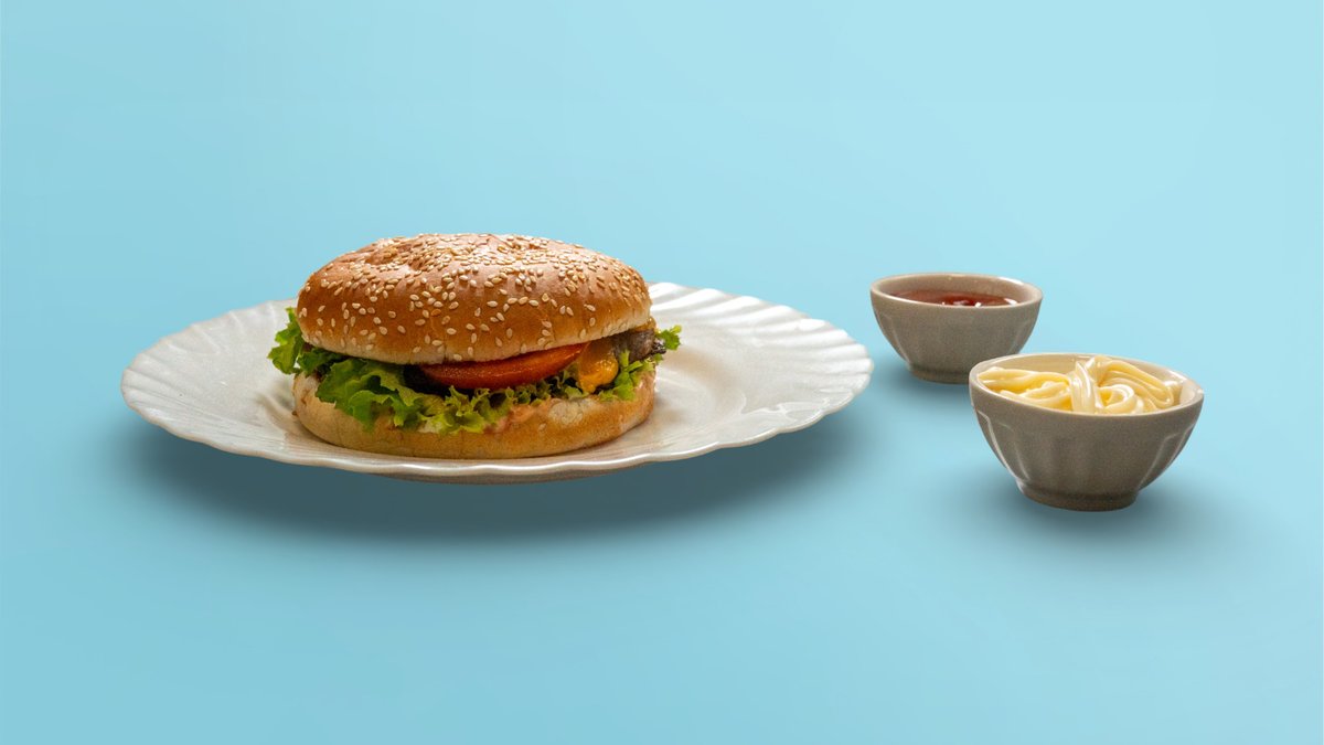 Hamburgerbrot, Salat, Tomatenscheibe, Mayonnaise, Ketchup, Cheddar, Rindfleisch und Pickles