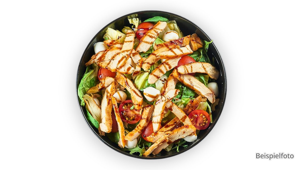 gemischter Salat mit gebratenen Hähnchenbruststreifen und hausgemachtem Pesto