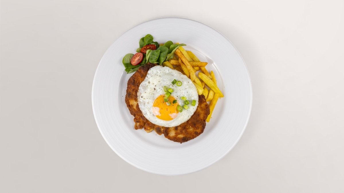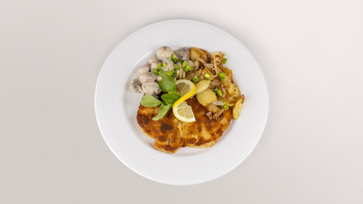 paniertes Schweinerückensteak mit gekräutertem Pilzgemüse