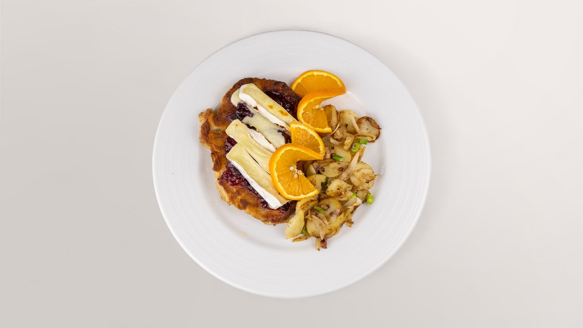 paniertes Schweinerückensteak mit Preiselbeeren und Camembert überbacken