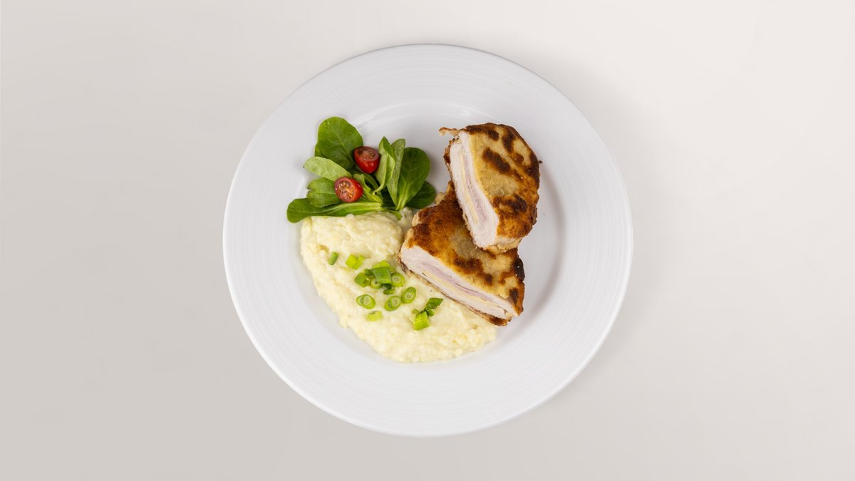 paniertes Schweinerückensteak mit Formschinken und Edamer gefüllt