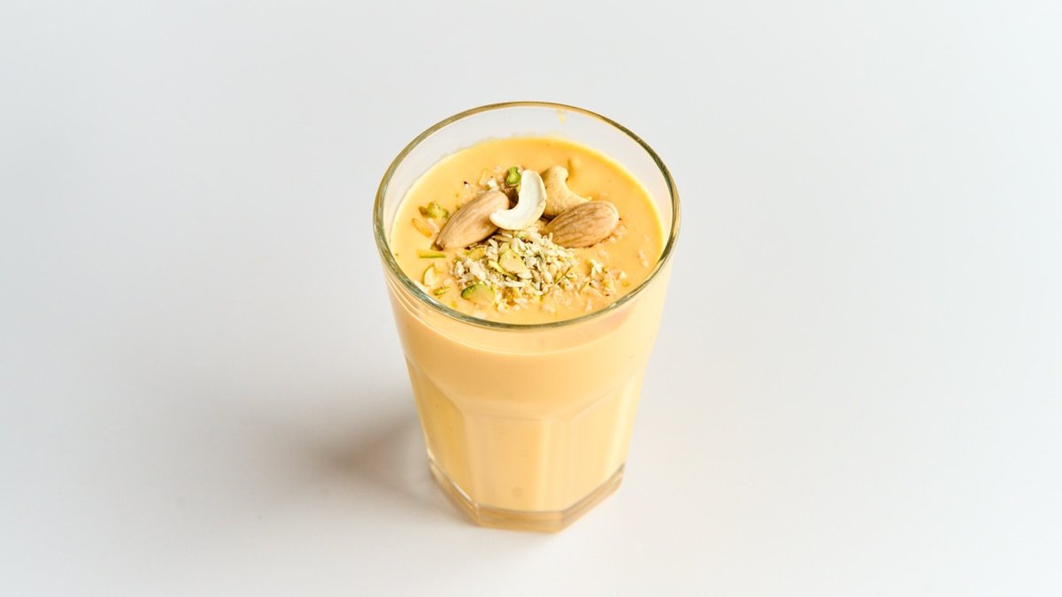 cremig Joghurt-Mango-Getränk mit Pistazien, Cashews und Mandeln