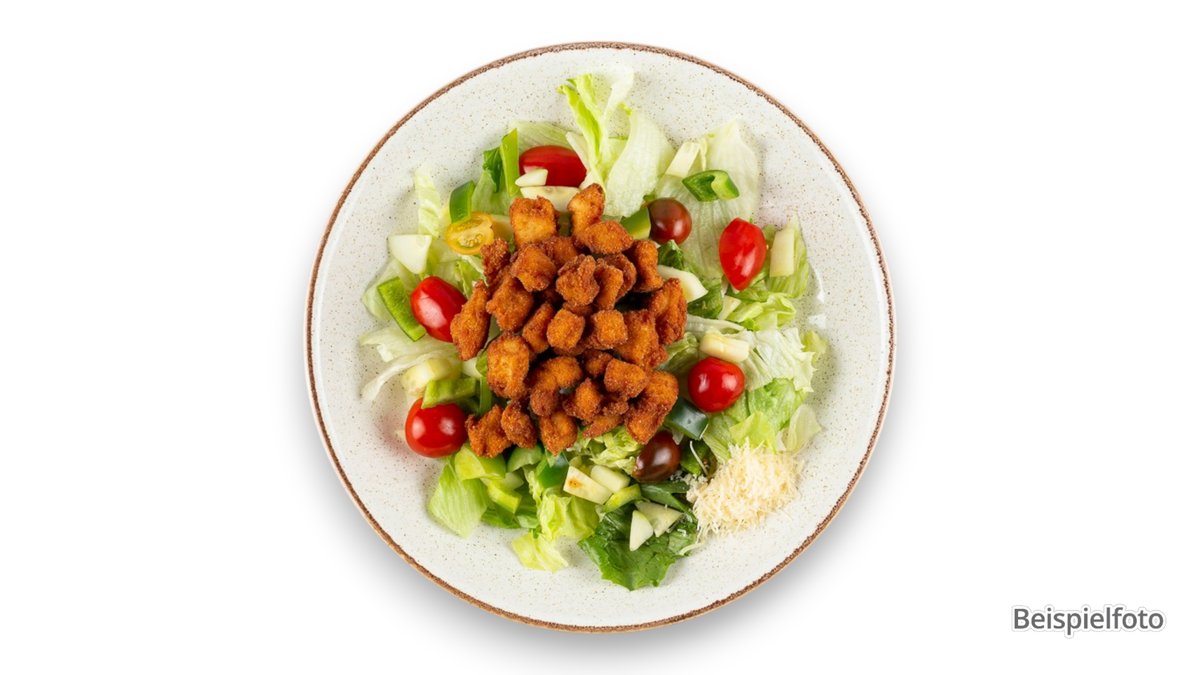 gemischter Salat mit gebratenem Putenfleisch, panierten Hähnchenstückchen, Ananas und Rucola