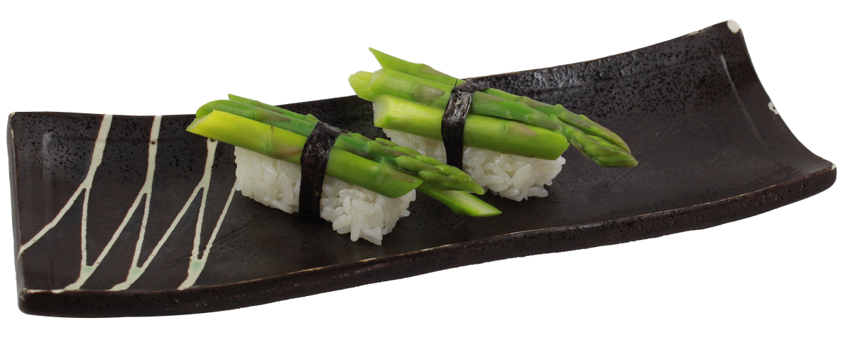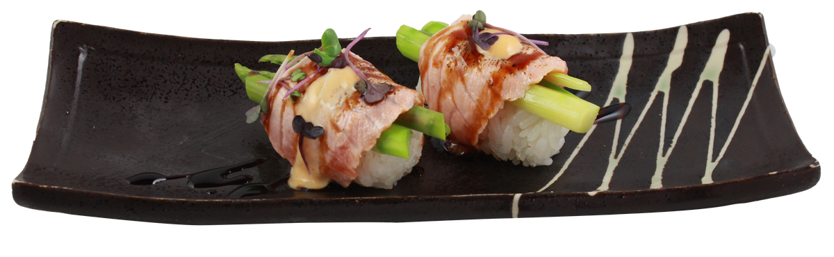 mit Lachs, Avocado, Philadelphia, Thunfisch obenauf, grünem Spargel, Sesam und Teriyaki-Soße