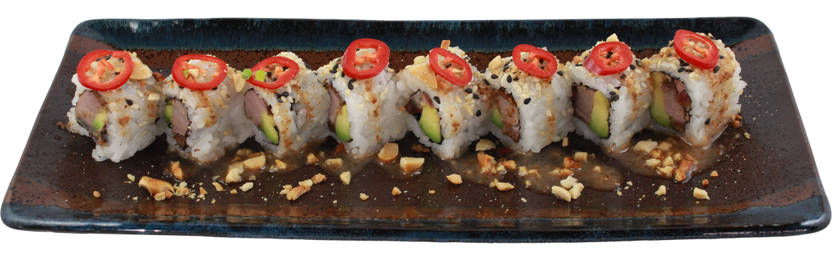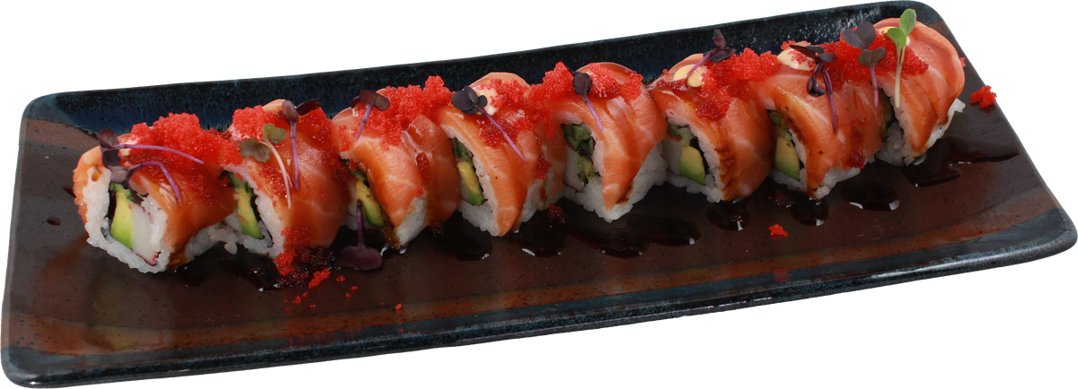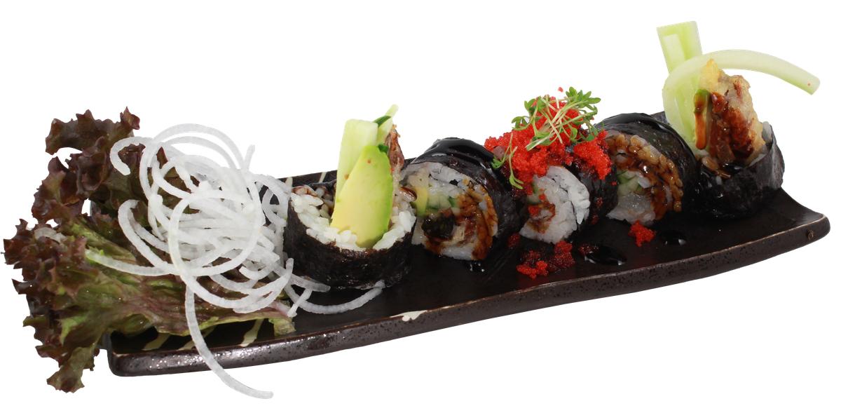 mit gegrilltem Aal, Avocado und Philadelphia, ummantelt mit Lachs, Thunfischfilet, Seetangsalat, Flugfischkaviar, Sesam und Teriyaki-Soße