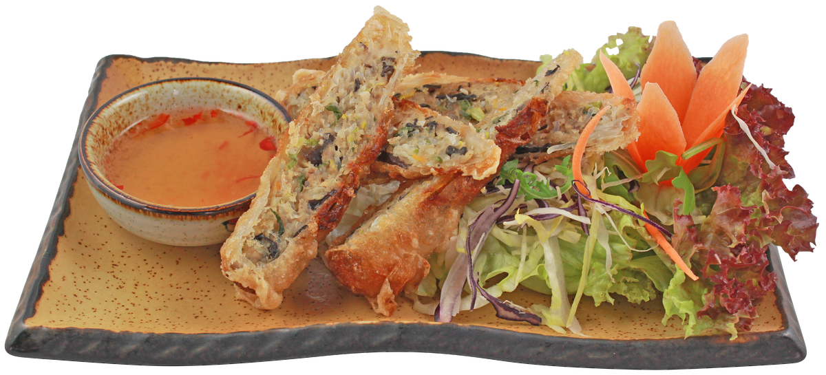 2 Stück frittiertes Reispapier mit gehacktem Schweinefleisch, Glasnudeln, Morcheln, Kohlrabi, Karotten und hausgemachtem Limetten-Dressing
