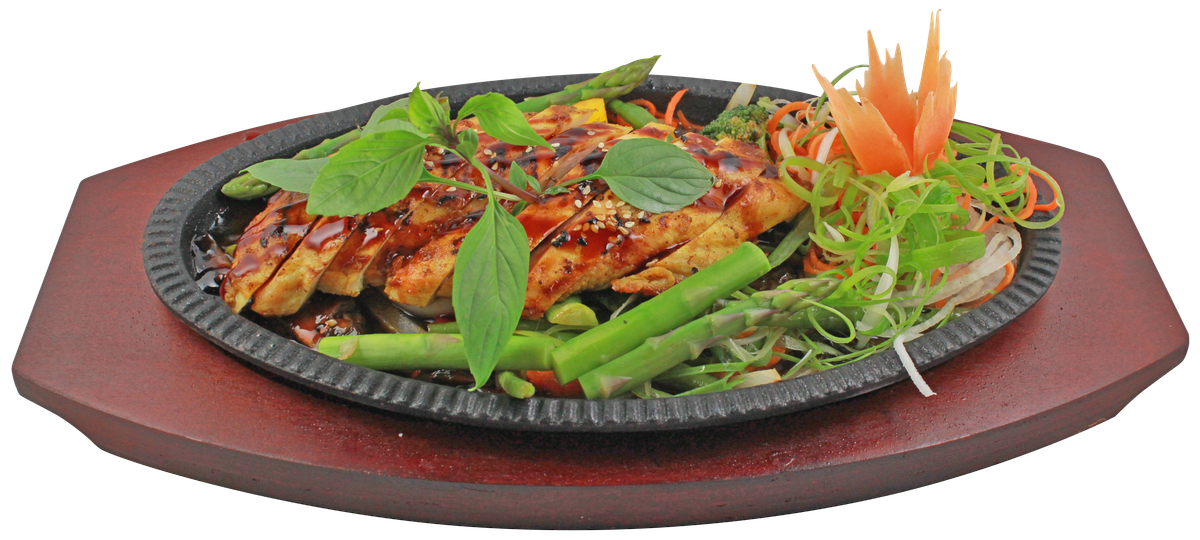gegrillte Ente mit Gemüse, Spargel, Zitronengras und Knoblauch in Chili-Soße, serviert mit Duftreis