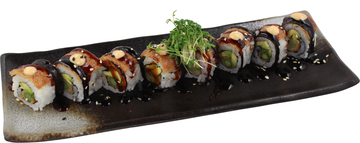 mit Butterkrebs-Tempura, Mango, Gurken, Tobiko, Sesam, Avocado obenauf und Unagisoße