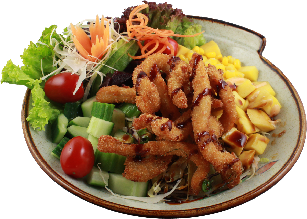 mit Garnelen, Salat-Mix, Sesam und hausgemachter Soße