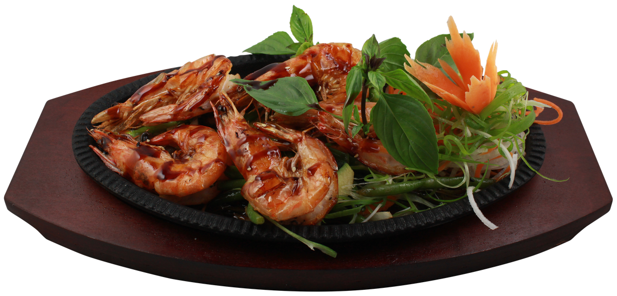gegrillte Garnelen mit verschiedenem Gemüse, Spargel und einer Soße deiner Wahl, serviert mit Duftreis