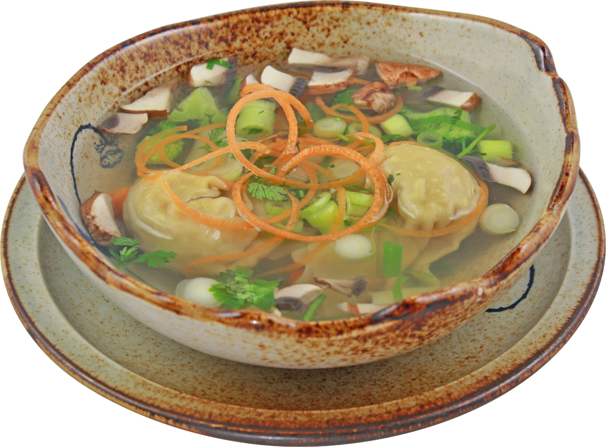 kräftige Brühe mit hausgemachten Teigtaschen, Hähnchenfleisch, Schweinefleisch, Garnelen, saisonalem Gemüse, Glasnudeln und Kräutern