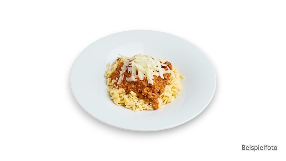 aus Rind- und Schweinefleisch, mit Käse, Pommes frites und Reis