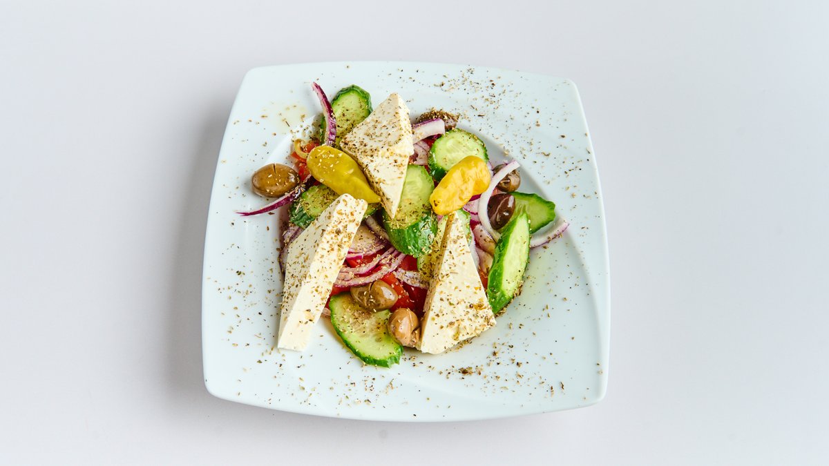 mit Feta, schwarzen Oliven, Zwiebeln, Tomaten und Gurken