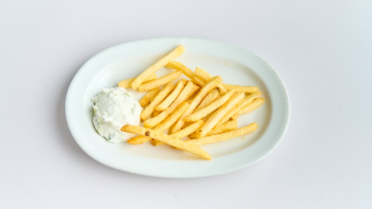 mit Pommes frites und Tzatziki