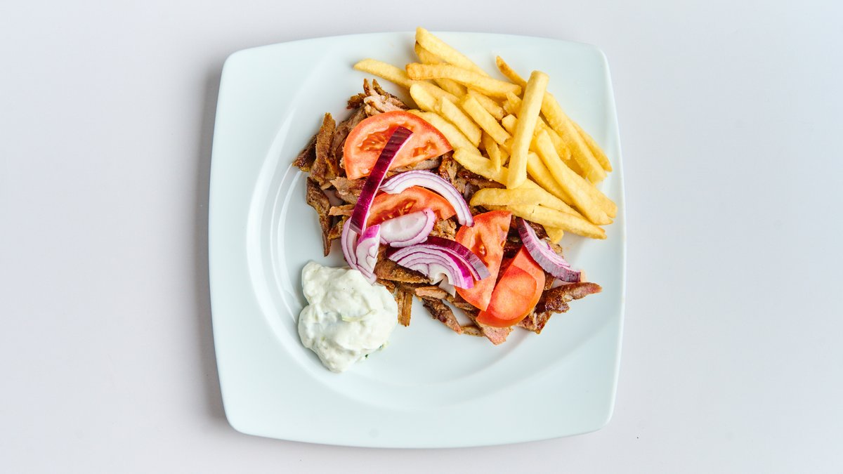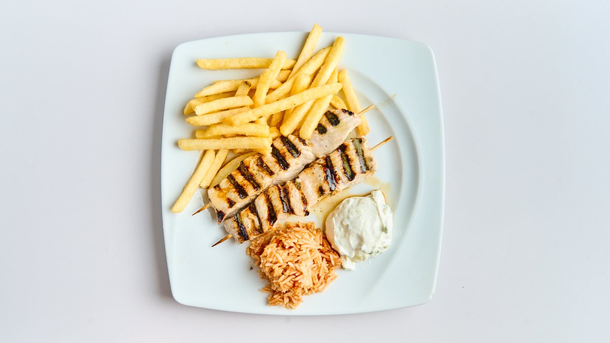 aus Schweinefleisch, mit Pommes frites, Tomaten, Zwiebeln, Tzatziki und Reis