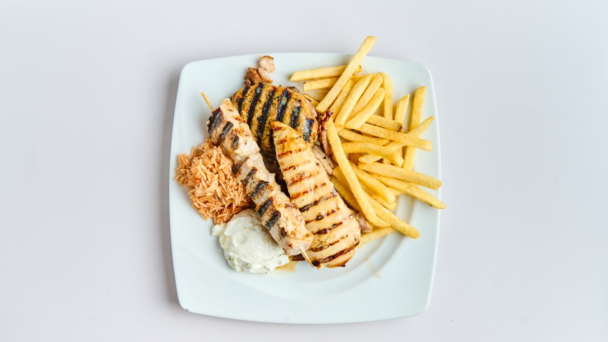 mit Gyros vom Schwein, Rinderbifteki, Hähnchen, Schweinefilet, Lammkotelett, Pommes frites, Tzatziki und Reis