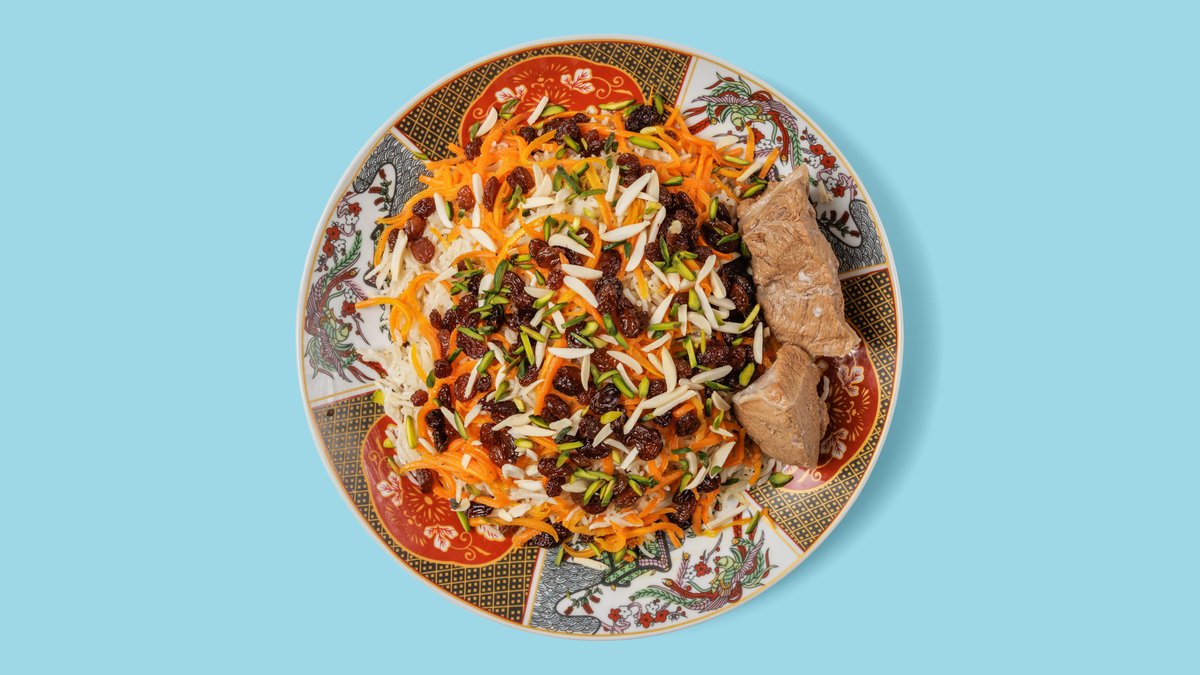mit gebackenem braunem Basmatireis, karamellisierten Karottenstreifen, Kalbfleisch, Rosinen und Kofta-Soße