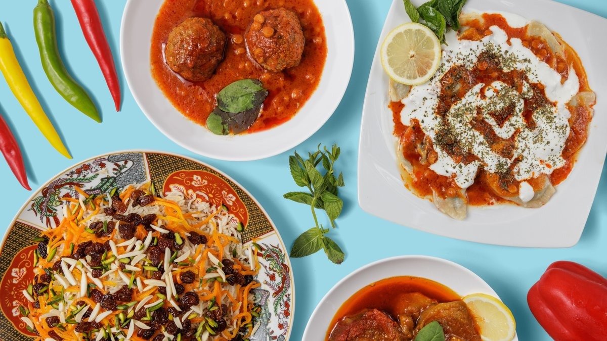 Rinderhackbällchen mit afghanischer Tomatensoße, gelben Linsen und Safranreis