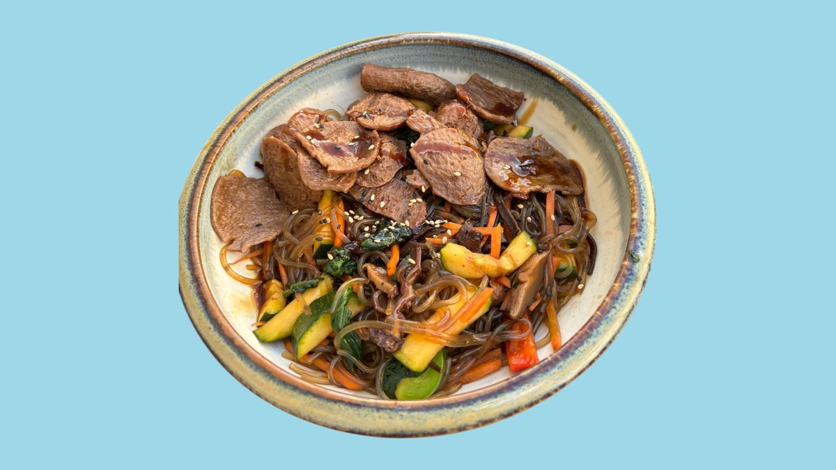 gebratene koreanische Süßkartoffelnudeln mit Paprika, Möhren, Spinat, Zucchini, Shiitake mit einer Zutat deiner Wahl und einer Soße deiner Wahl