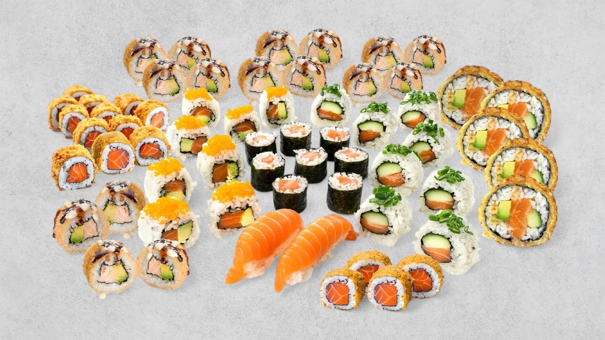 39 Stück mit 2x Nigiri Sake, 8x Maki Sake, 8x Alaska Roll-Masago, 8x Philadelphia Roll-Schnittlauch, 8x Mini Yoko Roll Sake und 5x Yoko Roll Lachs