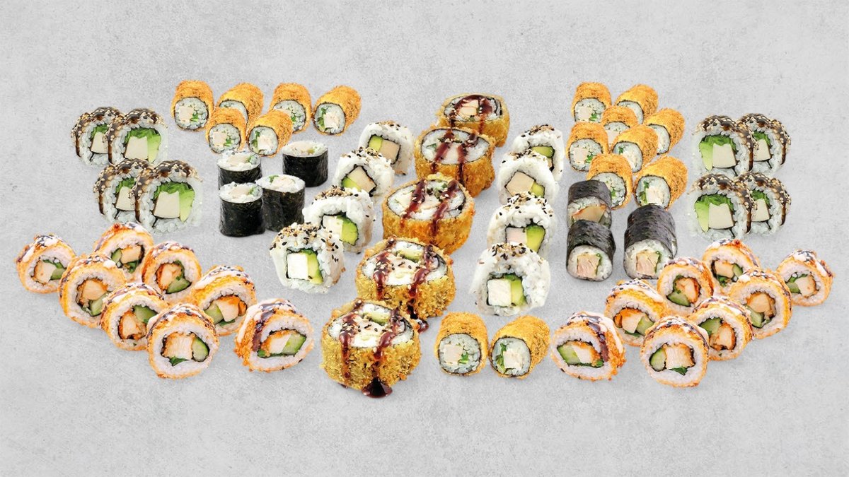 42 Stück 5x Yoko Roll Lachs, 5x Yoko Roll Vegetaria, 8x Chicken Teriyaki Roll - Sesam, 8x Maki Sake und 8x Maki Kappa, 8x California Roll - Masago mit Surimi aus Krebsfleisch-Imitat, aus Fischmuskeleiweiß geformt Aufgrund der Art und Weise der Aufbewahrung können die Produkte mit Nüssen in Kontakt kommen.