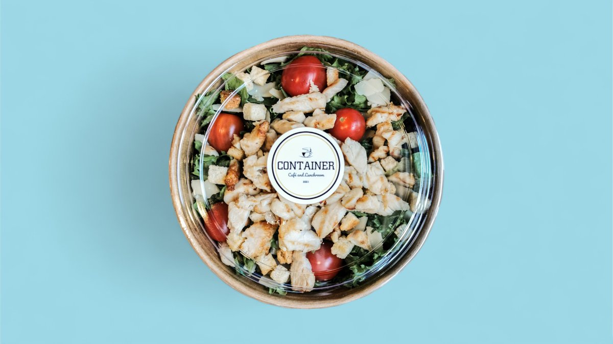 mit Hähnchenstücken, Parmesan, Eiern, Kirschtomaten, Croutons und Chia-Samen